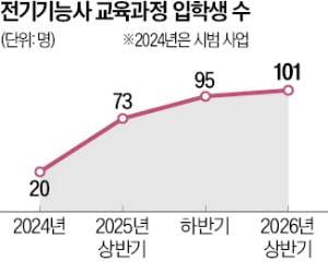 전기기능사 교육과정은 2024년 근로복지공단과 대한상의가 시작한 사업이다. 20명의 입학생을 대상으로 시범사업을 시작했다가 반응이 좋아 지난해 정식 교육과정으로 개설됐다. 입학생은 지난해 상반기 73명, 하반기 95명, 올해 상반기 101명으로 증가하는 추세다. 대한상의는 하반기에도 비슷한 규모로 올해 총 200명의 교육생을 받을 계획이다.