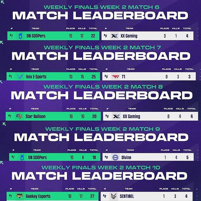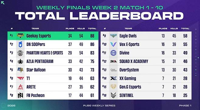 2주 차 '위클리 스테이지’에서 생존한 16개 팀의 대결이 펼쳐진 '위클리 파이널' 2일 차. 준비된 다섯 매치를 모두 치른 결과, 지케이 이스포츠가 총점 88점으로 1위에 올랐다. 뒤를 이어 86점의 DN 수퍼스가 2위, 83점의 팬텀 하츠 이스포츠가 3위에 올라 상위권을 형성했다. 서부(상위 TOP8)의 막차는 61점의 FN포천이 차지했다.