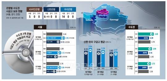 이 밖에 국민은행은 광진구, 동대문구, 도봉구, 노원구, 동작구 등 5개구를 맡고 있다. 이들 자치구의 평균 금리는 3.33%로 우리은행과 신한은행이 맡은 자치구 평균값의 중간 정도였다.