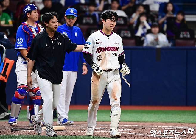 (엑스포츠뉴스 고척, 유준상 기자) 키움 히어로즈 외야수 박수종이 삼성 라이온즈의 아시아쿼터 투수 미야지 유라의 투구에 머리 쪽을 맞으면서 경기를 다 소화하지 못했다.