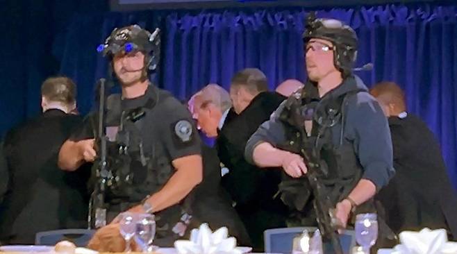 | 경호원에 둘러싸여 대피하는 트럼프 미국 워싱턴의 힐튼호텔에서 25일(현지 시간) 열린 백악관 출입기자협회(WHCA) 만찬 행사에서 총격 사건이 발생했다. 만찬에 참석 중이던 도널드 트럼프 미국 대통령(가운데)은 총소리가 난 직후 몸을 수그린 채 경호원들에게 둘러싸여 긴급히 대피하고 있다. 사진 출처 X |
