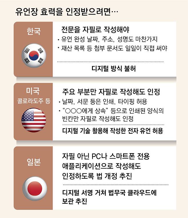 전문가들은 ‘디지털 유언장’을 도입한 선진국처럼 유언장 작성 체계를 시대에 맞게 손봐야 한다고 지적한다. 일본 정부는 이달 초 스마트폰 애플리케이션(앱)으로 작성한 유언장도 효력을 인정하고 이를 공적 클라우드에 보관해 주는 내용의 민법 개정안을 확정해 국회 제출을 앞두고 있다. 소순무 유언법제변호사모임 회장은 “유족 간 분쟁을 예방하려면 구시대적인 법을 개편해 보다 간편하게 유언을 남길 수 있는 문화와 환경을 조성해야 한다”고 제언했다.
