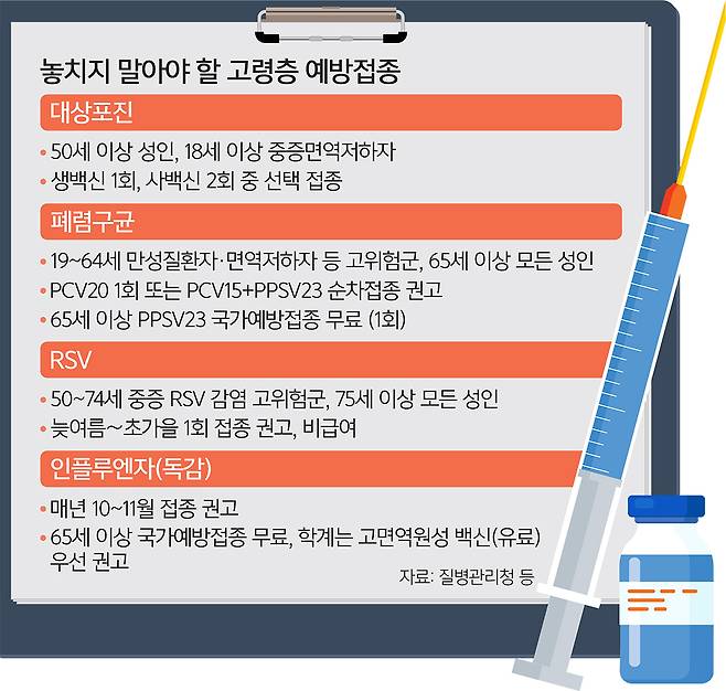 독감 백신도 마찬가지다. 65세 이상 고령자에게 무료로 접종하는 표준 4가 독감 백신의 예방 효과는 30~40% 수준에 그친다. 면역노화로 항체 생성 반응이 젊은 층보다 크게 떨어지기 때문이다. 대한감염학회는 면역 반응을 강하게 유도하는 고면역원성 인플루엔자 백신을 65세 이상에게 우선 접종하도록 권고하고 있지만, 국가필수예방접종에 포함되지 않아 비용 전액이 본인 부담이다. 이 교수는 “학회가 고면역원성 백신 접종을 권고한 지 7~8년이 됐는데 아직도 국가필수예방접종에 포함이 안 됐다”며 “일반 백신보다 가격이 두 배 수준이지만 입원·사망을 줄이는 비용 대비 효과는 충분히 입증됐다”고 말했다.
