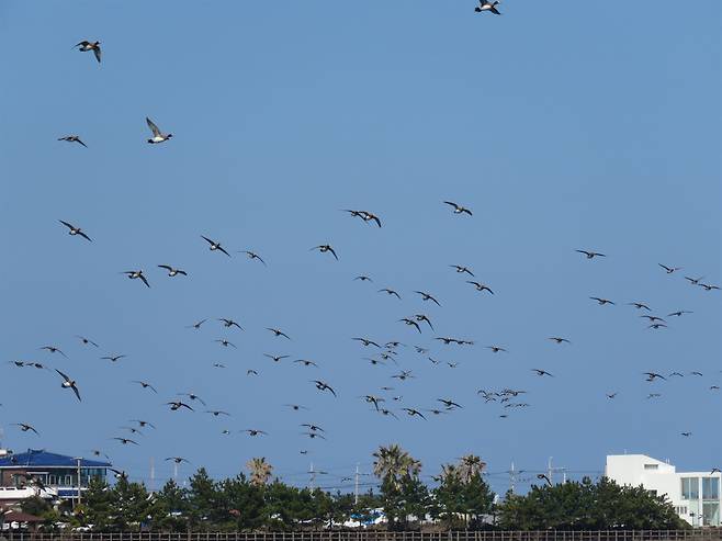 | ▲ 겨울철 철새도래지가 밀집한 성산읍 제2공항 예정부지는 조류충돌 우려가 있다는 지적이 나온다. 성산읍 신양리의 바닷가 마을 상공에 오리떼가 수직 상승하여 날고 있는 모습. 2023년 2월27일 오후 2시31분 촬영. |