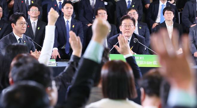 | ▲ 이재명 대통령이 지난 3월 30일 제주한라대학교 한라컨벤션센터에서 열린 타운홀미팅 '제주의 마음을 듣다'에서 발언권 요청을 받고 있다. |