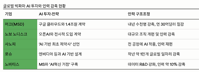 주목할 점은 공격적인 AI 투자가 대규모 인력 감축과 동시에 진행되고 있다는 점이다. 머크는 2027년 말까지 직원 수천 명을 해고하는 구조조정안을 실행하고 있다. 연간 30억달러(약 4조 4325억원)의 비용을 절감하는 계획이다. 기술이 사람을 대체하는 ‘AI 빅뱅’이 현실화되고 있는 셈이다.