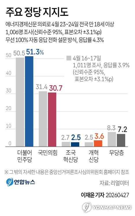 (서울=연합뉴스) 이재윤 기자 = 리얼미터가 에너지경제신문 의뢰로 지난 23∼24일 전국 18세 이상 1천6명을 대상으로 한 정당 지지도 조사에서는 더불어민주당이 51.3%, 국민의힘이 30.7%의 지지율을 기록했다.