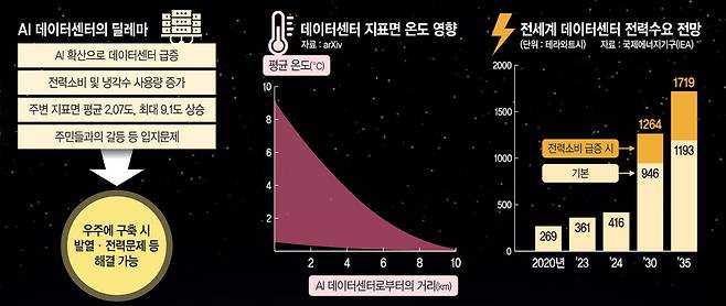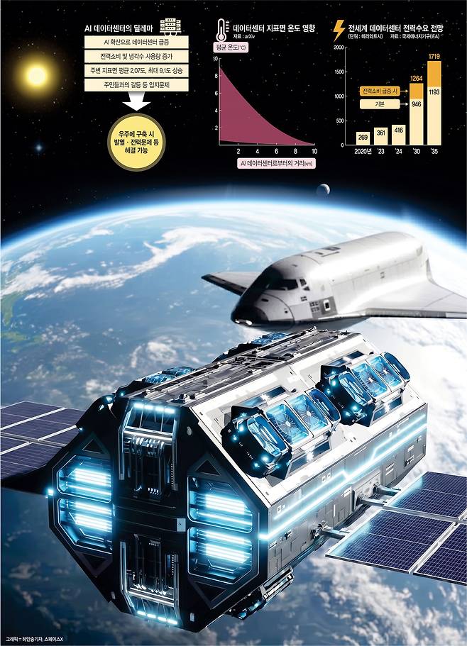 ◇해법으로 떠오른 우주 데이터센터= 이 때문에 최근에는 데이터센터를 아예 지상 밖으로 올리려는 발상이 연구 과제로 떠오르고 있다. 태양광을 활용해 비교적 안정적으로 전력을 확보하고, 지상보다 유리한 환경에서 열 방출 문제를 풀 수 있다면 AI 인프라의 부담을 분산할 수 있다는 것이다. 특히 심우주는 태양을 등진 방향 기준으로 극저온 환경이 형성돼 열 관리 측면에서 잠재적 장점이 있다는 평가가 나온다.