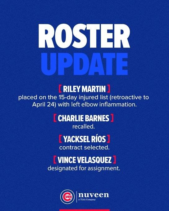 미국 MLB 전문 매체 'MLB 트레이드 루머스'는 27일(한국시간) "컵스가 우완 약셀 리오스와 좌완 찰리 반즈를 콜업하는 대신 우완 빈스 벨라스케즈를 지명할당했다"고 전했다. 이어 "좌완 라일리 마틴은 팔꿈치 염증으로 15일 부상자 명단에 올랐다"고 덧붙였다. 컵스 구단 역시 같은날 이 선택을 공식 발표했다.