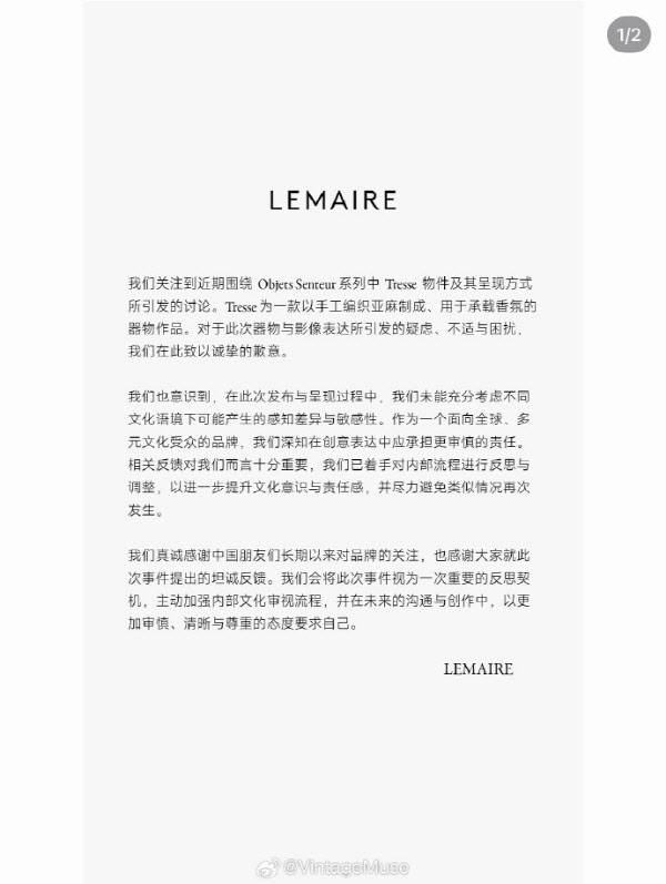 르메르는 이번 제품 발표 때 서로 다른 문화적 맥락에서 발생할 수 있는 인식 차이와 민감성을 충분히 고려하지 못했다는 것을 인식했다면서 전 세계 다문화 대상 브랜드로서 창의적인 표현에 더 신중한 책임을 져야 한다는 걸 알고 있다고 강조했다.