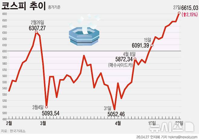 [서울=뉴시스] 코스피가 반도체 업종 강세와 실적 모멘텀이 맞물리며 사상 처음으로 6600선을 넘겨 마감했다. 27일 코스피는 전 거래일보다 139.40포인트(2.15%) 상승한 6615.03에 거래를 마쳤다. (그래픽=안지혜 기자)
