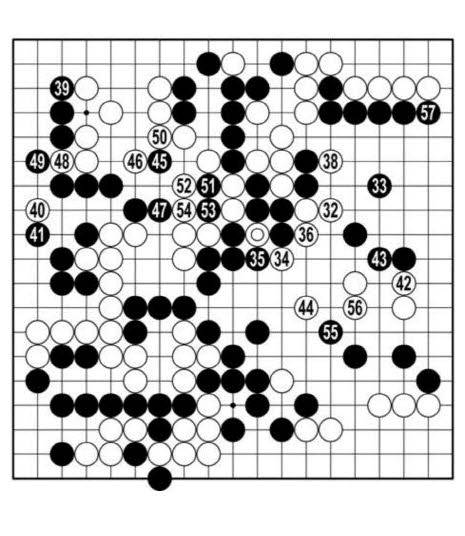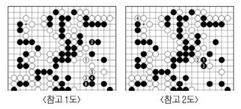 백32로 늘었다. 38로 흑 두 점이 잡히는 걸 알면서도 흑33으로 물러났다. 흑은 오른쪽에서 움직이는 백을 공격할 생각을 접었다. 백38로 <참고 1도> 1에 이어가는 것은 욕심. 흑2로 두 점을 살리면 갇힌 백돌은 살지 못한다. 흑39가 큰 곳. <참고 2도>처럼 오른쪽 백 두 점을 거둬들이면 백이 4를 차지한다. 형세는 아직 한쪽으로 기울지 않았다. (37…◎)