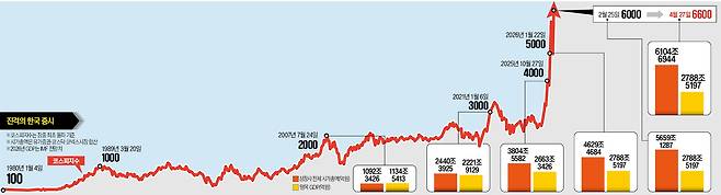 국내 주식시장 시가총액이 사상 처음으로 6000조원을 돌파했다. 지난 2월 3일 5000조원을 넘어선 지 83일 만이다. 미국과 이란의 지정학적 갈등이 ‘피크아웃’을 지나면서 짓눌려 있던 투자심리가 되살아난 영향이다. 실적 시즌을 맞아 반도체와 전력 등 에너지 업종으로 온기가 확산하는 점도 지수를 끌어올리고 있다.