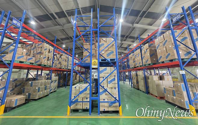 | ▲ 창고에서 출고를 앞둔 한국백신 생산 주사기들. |