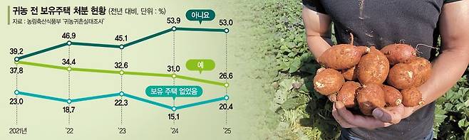 도시 집을 파는 경우는 점점 줄어든 것이다. 귀농 자체가 리스크가 있다 보니 안전자산을 남겨둔 채 농사에 도전해서다. 서울 주택의 세금 증가분이 더 커진다면 귀농이 더 어려워질 것이란 농업계 진단도 나온다. 실제 귀농인 중 수도권에서 이동한 비율은 2024년 42.2%다.