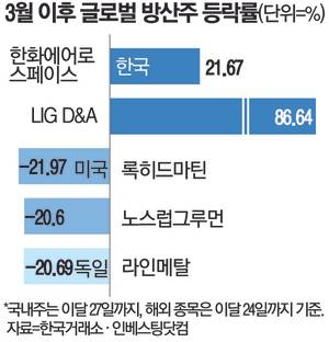 반면 같은 기간 미국과 유럽의 주요 방산주는 지정학적 리스크에도 부진한 흐름을 보이고 있다. 전통의 강자 미국 록히드마틴은 지난 3월부터 이달 24일까지 주가가 21.97% 하락했다. 같은 기간 노스럽그루먼 주가도 20.60% 떨어졌다. 유럽 증시에서는 독일 라인메탈이 20.69%, 프랑스 탈레스가 8.67% 하락했다.