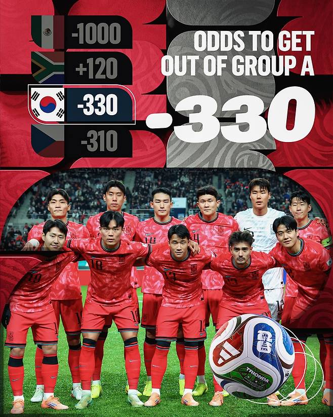 매체는 A조를 통과할 국가별 배당률을 공개했다. 한국은 -330으로 멕시코(-1000)에 이어 조 2위에 올랐다. 체코가 -310으로 3위, 남아공은 +120으로 최하위에 머물렀다.