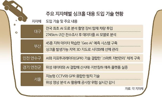 전국 지방자치단체가 도심 속 ‘시한폭탄’으로 불리는 싱크홀(지반침하)을 예방하고자 인공지능(AI), 위성, 사물인터넷(IoT) 등 첨단기술을 융합한 ‘지능형 지하 안전망’ 구축에 나서고 있다. 늘어나는 각종 공사로 인한 동시다발 굴착, 마구잡이식 지하공간 활용에 따른 지반 약화 등으로 땅 꺼짐 사고 위험이 줄어들지 않고 있기 때문이다.
