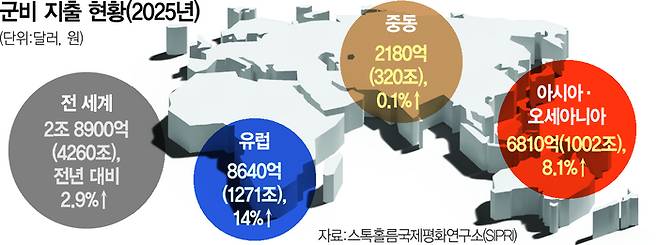 유럽은 도널드 트럼프 미국 대통령의 나토(NATO) 탈퇴 시사와 러시아 위협 증대를 배경으로 군사비를 전년 대비 14% 늘린 8640억 달러(약 1271조 원)를 기록하며 역대 최고치를 경신했습니다. 독일은 24% 증가한 1140억 달러로 유럽 최대 군사비 지출국에 올랐고, 스페인은 무려 50% 늘어나 1994년 이후 처음으로 GDP 대비 2.0%를 넘었습니다.