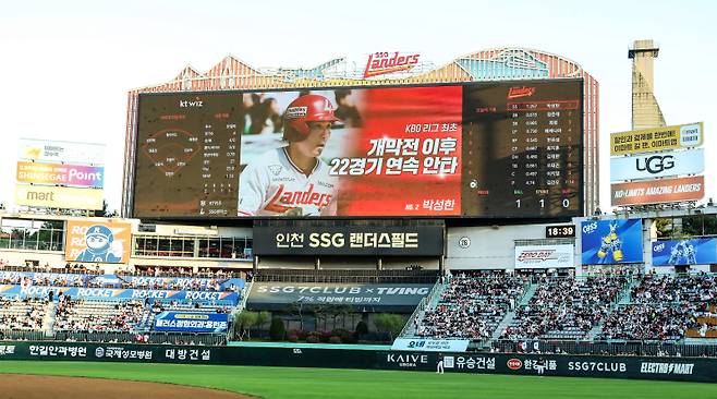 박성한은 지난달 28일 KIA 타이거즈와의 시즌 개막전부터 24일 KT 위즈전까지 22경기 연속 안타를 치며 1982년 김용희(은퇴)가 갖고 있었던 종전 '개막 최다 연속 경기 안타' 기록(18경기)를 넘어섰다. 한 단계 향상된 타격을 앞세워 올 시즌 유격수 부문 골든글러브 수상을 노린다.