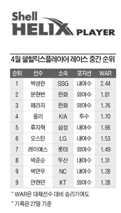 쉘힐릭스플레이어는 월간 대체선수 대비 승리기여도(WAR) 1위에 오른 투수와 타자에게 수여한다. 4월 타자 부문은 박성한이 독주하고 있다. 그는 27일 기준으로 WAR 2.44를 기록했다. 출전한 24경기에서 타율 0.451(91타수 41안타) 20도루 18득점, 출루율 0.541를 기록했다. 안타·타율·출루율 1위에 올라 있다.