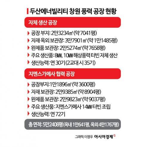 두산에너빌리티는 원래 화력발전소용 보일러 스팀 배관 공장이던 이곳을 신재생에너지 시대에 맞춰 2023년 풍력발전기 공장으로 개조했다. 천장에는 150t까지 들어 올릴 수 있는 크레인을 설치했다. 남경민 두산에너빌리티 풍력 공장장은 "연간 약 30대의 풍력터빈을 생산할 수 있는 능력을 갖추었다"며 "향후 설비를 확충하면 40대까지도 생산할 수 있을 것"이라고 말했다.