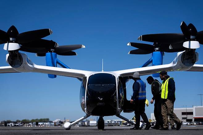 [뉴욕=AP/뉴시스] 27일(현지 시간) 미국 뉴욕 존 F. 케네디 국제공항에서 '조비 에비에이션'의 전기 수직이착륙기(eVTOL) 조종사가 기체에 탑승하고 있다. 조비 에비에이션은 '하늘을 나는 택시'로 불리는 eVTOL의 실제 비행경로와 환경에서의 운항을 검증하는, 열흘간의 시범 비행에 나섰다. 2026.04.28.