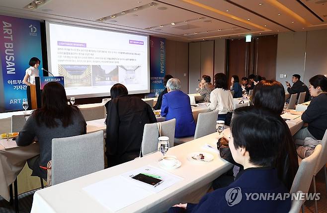 (서울=연합뉴스) 진연수 기자 = 28일 서울 중구 신라호텔에서 열린 국제 아트페어 '아트부산 2026' 기자간담회에서 정선주 이사가 전시 프로그램을 소개하고 있다. 2026.4.28