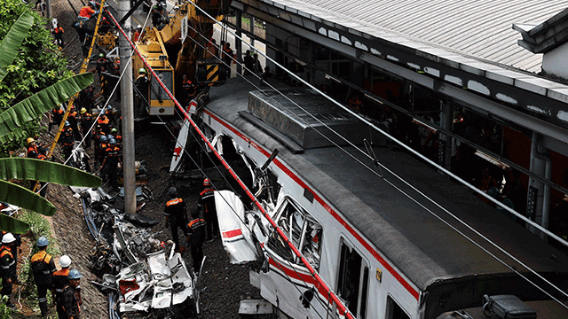 바비 라시딘 KAI 사장은 자카르타-베카시 노선을 운행하던 통근 열차가 선로에서 택시 한 대와 먼저 충돌한 뒤, 자카르타-수라바야 노선을 운행하던 장거리 열차를 추돌했다고 설명했습니다.