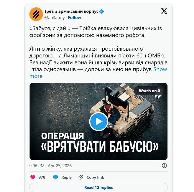우크라이나군은 이 밖에도 드론을 이용해 민간인 3명을 추가로 대피 지점으로 안전하게 안내한 후 전투 지역에서 탈출시켰다고 설명했다.