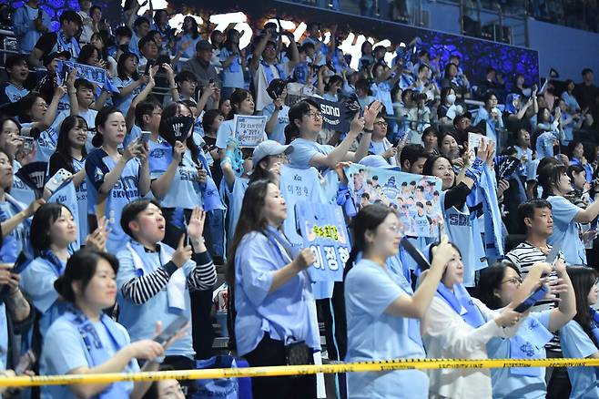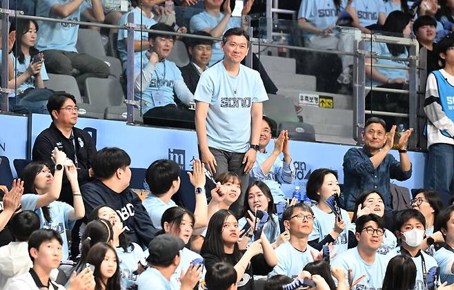 소노의 구단주인 서준혁 회장은 6강 플레이오프의 열기를 가까이서 지켜봤다. 팬들과 다름없이, 하늘색 티셔츠를 착용. ‘위너스(소노 팬덤)’와의 일체감을 보여줬다. 장내 아나운서로부터 소개받을 때, 큰 열광을 받기도 했다.