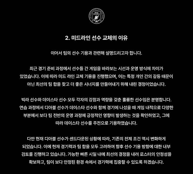 향후 로스터 운영에 대해서는 "'디아블'이 센드다운된 상황에 따라 기존 전제 조건 역시 변화하게 됐다"며 "현재 경기력과 팀 합을 모두 고려해 향후 선수 기용 방향에 대한 내부 검토를 진행하고 있다. 가능한 빠른 시일 내에 최선의 결정을 내려 로스터의 안정성을 확보하겠다"고 밝혔다.