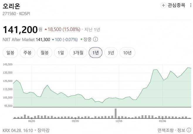 28일 오리온 주가는 14만1200원에 마감했다. 지난해 말(10만5700원)과 비교하면 33.6% 상승했다. 최근 중동전쟁 여파로 급등한 사료주를 제외하고 국내 음식료 업종 가운데 수익률 1위다. 같은 기간 CJ제일제당(12%), 롯데웰푸드(5.8%), 삼양식품(4.4%) 등을 압도한다. 농심(-12.3%), 롯데칠성(-12.1%)은 같은 기간 마이너스였다.