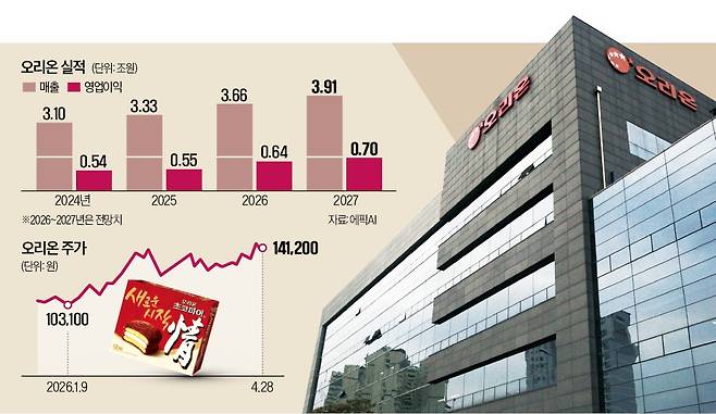 28일 오리온 주가는 14만1200원에 마감했다. 지난해 말과 비교하면 33.6% 상승했다. 최근 중동 전쟁 여파로 급등한 사료주를 제외하고 국내 음식료 업종 가운데 수익률 1위다. CJ제일제당(12%), 롯데웰푸드(5.8%), 삼양식품(4.4%) 등을 압도한다. 농심(-12.3%), 롯데칠성(-12.1%)은 같은 기간 마이너스였다.