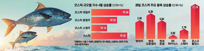 이달 들어 28일까지 코스피 대형주 지수는 34% 넘게 치솟아 전체 지수 상승률(32%)을 웃돈 반면 중형주는 23%, 소형주는 14% 오르는 데 그쳤다.