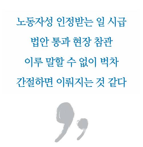 공 위원장은 “노동의 가치는 직업과 무관하게 평등해야 하고, 민간기업이 쉴 때 관공서만 문을 열면 사회 전반의 효율성이 떨어진다는 걸 정부와 정치권도 점차 수긍해갔다”며 “3월31일에 국회에서 법안이 통과되는 현장을 참관했는데, 이루 말할 수 없이 벅찼다”고 했다.
