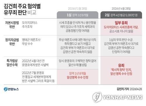 [그래픽] 김건희 주요 혐의별 유무죄 판단 비교