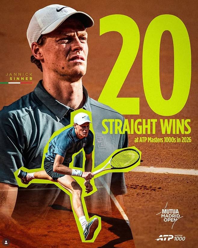 시너는 28일(한국시간) 계속된 마드리드 오픈 4회전에서 노리를 세트 스코어 2-0(6-2, 7-5)으로 꺾고 8강에 안착했다. 이번 승리로 시너는 마스터스 1000 대회 25연승을 달성했으며, 2026 시즌 마스터스 1000 대회에서 20승 무패라는 압도적인 성적을 기록하게 되었다.