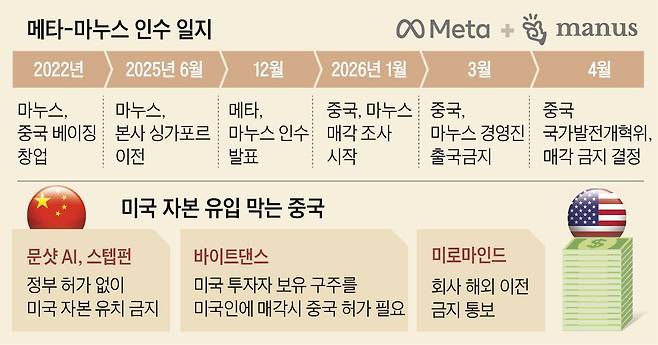 중국 정부가 메타의 중국계 인공지능(AI) 스타트업 ‘마누스’ 인수 거래에 대해 불허 명령을 내렸다. 올 1월 20억달러(약 3조원) 규모의 인수 거래가 중국의 기술 수출 관련 규정을 어겼을 수 있다며 조사에 착수한 지 약 4개월 만에 나온 결정이다. 중국 정부가 본사가 해외에 있는 ‘중국계’ 기업의 자본 조달·인수·합병 활동에 직접적으로 제동을 건 것은 이번이 처음이다. 이를 두고 테크 업계에선 “중국이 자국 AI 인재와 기술의 유출을 막기 위해 미국 자본의 투자를 끊어내기 시작했다”고 평가했다.