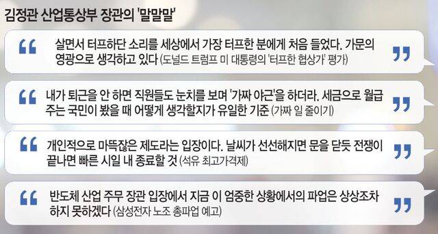 김 장관은 최근 삼성전자 노조의 파업 움직임에 대해 에둘러 말하지 않았다. 그는 언론 브리핑에서 “이런 엄중한 상황에 파업은 상상조차 하지 못하겠다”며 경고의 뜻을 분명히 했다. 김 장관의 직격탄은 대미 투자 협상 과정에서 확연히 나타났다. 그는 “미국은 돈 한 푼 안 내는데 수익 배분은 5대 5다. 상식적으로 말이 되느냐”며 직격탄을 날렸다.