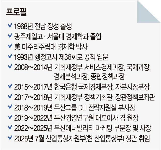김 장관은 지난해 7월 취임 이후 입체적 이력으로 주목받았다. 행정고시 36회로 공직에 입문해 옛 기획재정부(현 재정경제부) 요직과 한국은행 등을 두루 거친 경제 관료였던 그는 2018년 기업인으로 변신했다. 두산에너빌리티 마케팅부문장(CMO)과 사장 등을 지냈다.