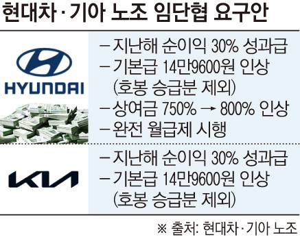 28일 전국금속노조 현대차지부에 따르면 현대차 노조는 올해 임금 및 단체협상(임단협) 요구안으로 월 기본급 14만9600원(호봉승급분 제외) 인상과 지난해 순이익의 30% 성과급 지급을 제시했다. 이와 함께 AI 관련 고용 및 노동 조건 보장, 상여금 750%에서 800% 인상, 완전 월급제 시행, 노동 강도 강화 없는 노동시간 단축 등도 포함됐다. 기아 노조 역시 기본급 14만9600원 인상과 함께 지난해 영업이익의 30% 수준 성과급 지급을 요구했다.