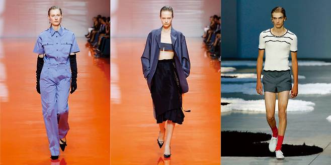 프라다의 컬렉션은 전혀 어수선하지 않다. 쓸모없는 것을 만들기 위해 쓸모없는 일을 하는 데에 반기를 든, 아주 단순한 방식으로 전개됐다. 런웨이에는 단조로운 콘크리트 기둥과 바닥 외에 아무런 장식도 두지 않았다. 모두의 예상을 깨고 여성복 컬렉션의 오프닝을 장식한 건 다름 아닌 실용적인 점프슈트였다. 군복으로 오해할 법한 딱딱한 분위기는 드롭 이어링, 팔꿈치까지 오는 오페라 장갑, 하이힐 같은 액세서리로 가볍게 깨졌다. 러프한 실루엣의 브라와 스커트 셋업에 단정한 테일러드 재킷을 입는 식의 살짝 어긋난 조합마저 재치 있게 느껴진다. 그런가 하면 남성복에서는 고무줄 밑단의 블루머 쇼츠가 처음 등장해 놀라움을 안겼다. 이제는 완전히 자리를 잡은 미우미우의 비즈 장식 브리프처럼 또 하나의 상징적인 아이템이 탄생한 순간이다. 이 외에도 타이트한 니트 스웨터에 쇼츠를 매치하는 등 남성의 보디라인을 보다 관능적으로 드러내며 실루엣을 재정의했다. 이런 과감한 움직임은 결국 코에드라는 한 단어로 귀결된다. 남성과 여성을 자유로이 오가는 프라다의 행보가 지금 패션계의 새로운 기준이 되고 있다.