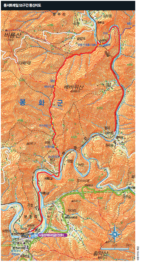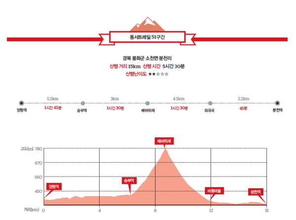 동서트레일 봉화구간은 47~51구간. 이 중 가장 하이라이트이자 개성이 뚜렷한 건 51구간이다. 승부역과 분천역을 잇는 낙동정맥트레일 2구간과 양원역과 승부역을 잇는 낙동강비경길을 이어 붙여 걷는다.