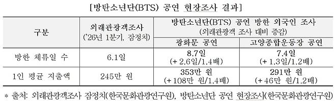 방탄소년단(BTS) 서울 광화문 광장과 경기도 고양 공연으로 방한 관광객이 국내에 더 오래 머물고, 더 많이 소비한 것으로 나타났다.