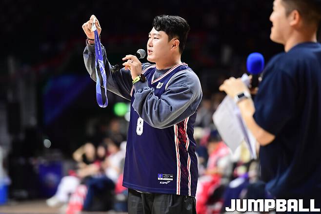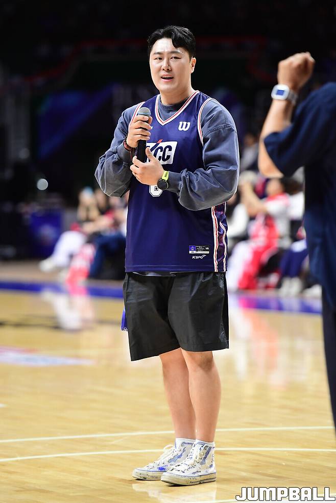 그 기운을 농구 코트로 들고 왔다. 하프타임에 만난 김상겸은 “농구를 해본 적은 없다. 이번에 처음 경기를 보는 건데 너무 재미있다”라고 방문 소감을 전하며 “관중도 엄청 많은 것 같다. 내부가 엄청 덥더라(웃음). 응원만 하는 데도 더울 정도로 열기가 장난 아닌 것 같다. 소리도 많이 질러서 목이 거의 잠기려고 하고 있다. 피자랑 치킨을 치어리더들이 나눠주는 이벤트도 나에게는 되게 색다르게 느껴진다”라고 농구 직관의 매력을 덧붙였다.