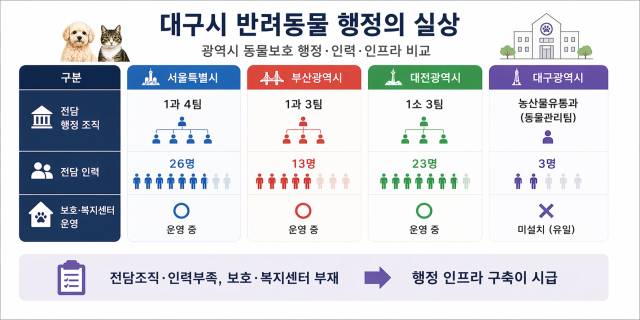 그러나 대구광역시의 동물보호·복지 업무는 여전히 농산물유통과 산하 '동물관리팀'에 머물러 있다. 전담 인력은 3명에 불과하며, 그마저도 가축 방역 업무가 우선되는 구조다. 반려동물 정책을 체계적으로 추진해야 할 '동물보호전담팀'은 구성조차 되어 있지 않다.
