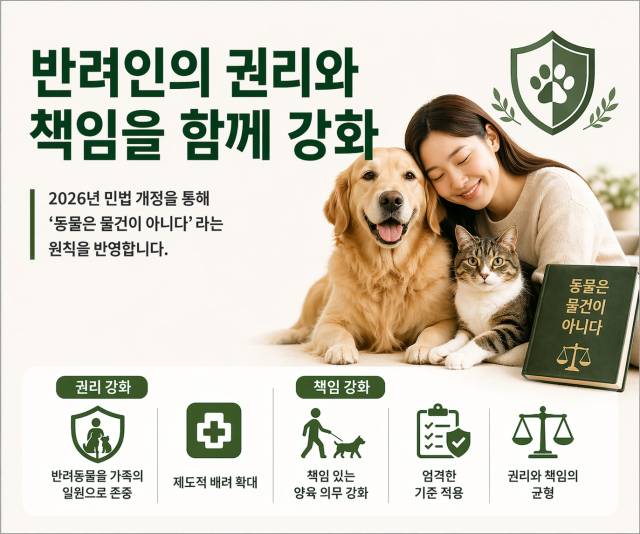 2026년에는 민법 개정을 통해 '동물은 물건이 아니다'라는 원칙을 반영하려는 논의가 이어지고 있다. 이는 반려동물을 단순한 소유물이 아니라 감정을 교감하는 생명체이자, 정서적 가족 구성원으로 바라보는 사회적 공감대가 충분히 형성되었음을 보여준다.