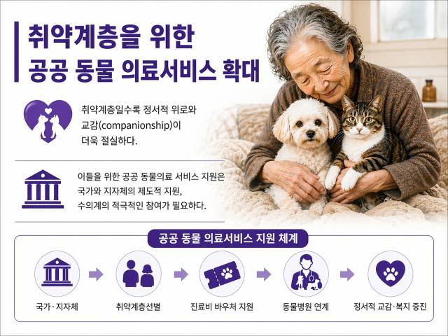 이들을 위한 공공 동물의료 지원은 국가와 지자체의 제도적 뒷받침, 그리고 수의계의 적극적인 참여가 함께 이루어져야 한다. 실효성 있는 지원이 지속되기 위해서는 동물진료비 바우처 제공을 통해 지역 동물병원과의 연계가 필요하며, 예방의료 지원 등 현실적인 협력 방안이 검토되어야 할 것이다.
