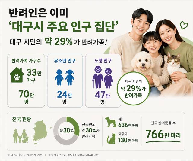 2025년 '농식품부 반려동물 양육 현황 조사보고서'에 따르면 대구시 총 세대 수의 30%에 해당하는 33만 가구가 반려 가족에 해당한다. 240만 대구 시민 중 29.2%에 해당하는 70만 명의 시민들이 반려가족이며, 약 53만 마리의 반려동물을 돌보고 있다.